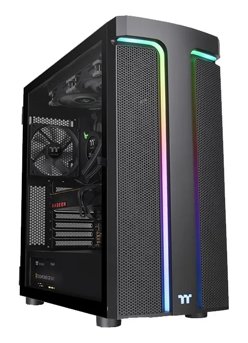 Admite placas base hasta E-ATX (12″ x 13″) y tiene un diseño único en el panel frontal, con dos tiras de iluminación RGB alrededor del pilar en forma de T. Sus efectos de iluminación se pueden controlar mediante el botón RGB físico en el panel de E/S o el software de la placa base de ASUS, GIGABYTE, MSI y ASRock.