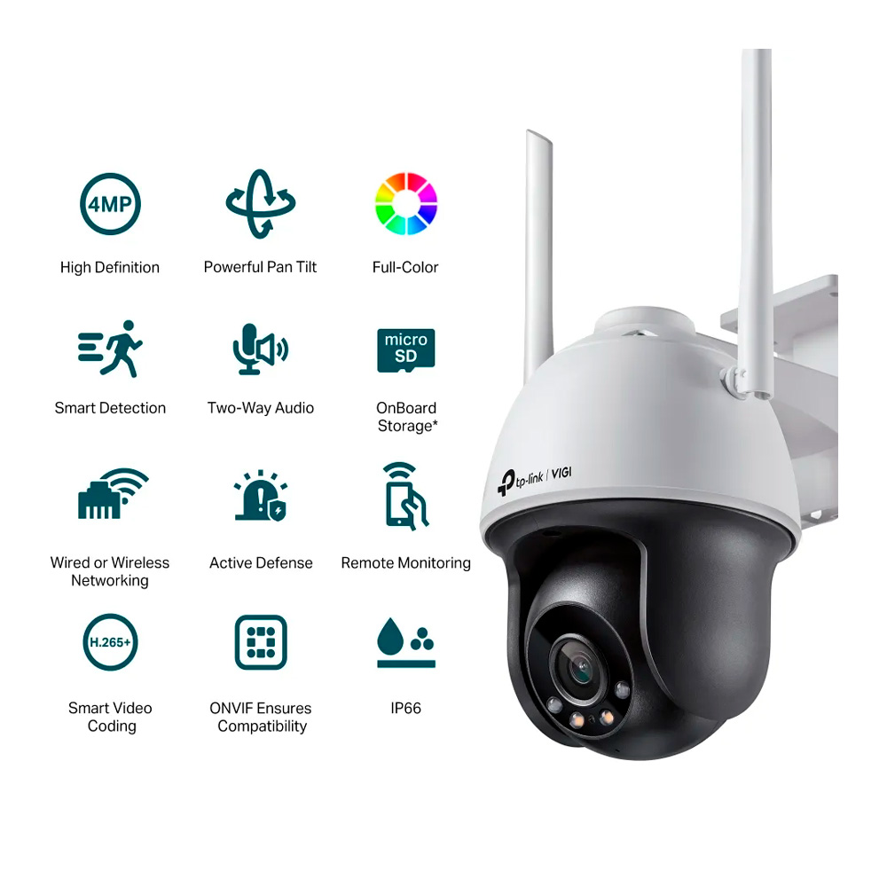 Cámara Wi-Fi IP de 4MP, Full Color, con Función de Paneo/inclinación. Especificaciones: 2.4Ghz a 150Mbps, 2*2 MIMO. Codecs H.265+/H.265/H.264+/H.264, CMOS de Escaneo Progresivo a 1/3, Color/0.04 Lux@F1.6, 0 Lux con IR/Luz Blanca, 25fps/30fps (2560×1440,2304×1296, 2048×1280, 1920×1080), 12V DC, Lente Fijo 4 mm, Micrófono, Parlante y ranura de Micro SD. INCLUYE: Visión Nocturna (hasta de 30M) a Full Color/IR, Defensa Activa, Audio de Dos vías, Almacenamiento incluido, Detección Inteligente (Detección de Movimiento con Clasificación Humana, Manipulación de la Cámara, Cruce de Línea, Intrusión de Área), SmartVid (IR Inteligente, WDR, 3D DNR, BLC), ONVIF. Monitoreo Remoto, App VIGI
